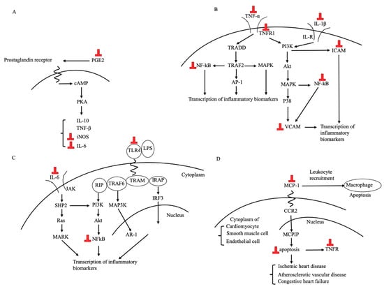 Signaling and pathways in which equol exerts anti-inflammatory effects. (A): PGE2 pathway []. (B): TNF-α [] and IL-1 pathway []. (C): TLR4 [] and IL-6 pathway []. (D): MCP-1 pathway []. “⏊” indicates the inhibitory effect by equol. PGE2: prostaglandin E2, cAMP: cyclic adenosine monophosphate, PKA: protein kinase A, IL: interleukin, TNF: tumor necrosis factor, iNOS: nitric oxide system, TNFR: TNF receptor, TRADD: TNFR1-associated death domain protein, TRAF2: TNF receptor-associated factor 2, PI3K or Akt: phosphoinositide 3-kinases, MAPK or P38: mitogen-activated protein kinase, AP: activator protein, NF-kB: nuclear factor kappa B, ICAM: intercellular adhesion molecule, VCAM: vascular cell adhesion molecule, IL-R: interleukin receptor, LPS: lipopolysaccharide, TLR: Toll-like receptor, TRIF: Toll/IL-1R domain-containing adaptor-inducing IFN-β, TRAM: TRIF-related adaptor molecule, TRAF: TNFR-associated factor, RIP: receptor-interacting protein, IRF: IFN regulatory factor, IFN: interferon, JAK: janus kinase, SHP: Src homology-2 domain-containing protein tyrosine phosphatase, AR: androgen receptor, MCP: monocyte chemoattractant protein, CCR: Chemokine receptor, MCPIP: monocyte chemoattractant protein-induced protein.