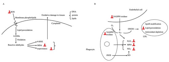 Progression of atherosclerotic plaque is caused by molecular changes induced by cytokines and reactive oxidant species (ROS) [,]. Myeloperoxidase (MPO) and nicotinamide adenine dinucleotide phosphate (NADPH) oxidase serve as enzymatic sources of oxidant species to generate oxidized LDL (oxLDL) [,]. The inhibition of NADPH oxidase activity reduced atherosclerotic lesions in animal models [,]. In humans, higher levels of oxidative biomarkers, such as oxLDL, MPO, and F2-isoprostanes, were associated with an increased risk of CHD [,,,,,]. In addition, individuals with MPO deficiency were found to have a very low incidence of CVD [].