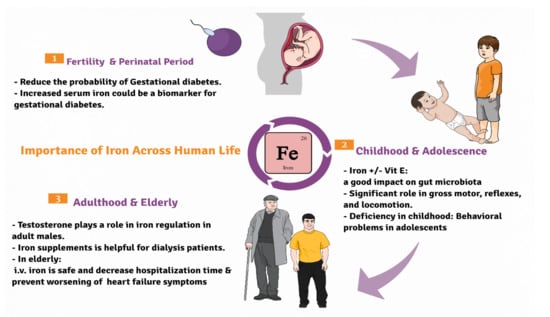 Diagrammatic sketch showing the importance of iron across life cycle of humans beginning from the fertile stage, childhood to the elderly.