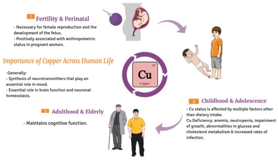 Copper is essential for the survival of humans; Figure 2. It is involved in many biochemical processes supporting life, such as antioxidant defense, mitochondrial respiration, development of connective tissue, melanin biosynthesis, iron homeostasis, and peptide hormone processing [131]. It acts as cofactor in tyrosine hydroxylase and dopamine hydroxylase enzymes, which participate in the synthesis of neurotransmitters that play an essential role in mood. Ions such as copper plays an essential role in brain function and neuronal homeostasis, and long-term imbalance of these metals has been linked to neurodegeneration and neurological disorder [132]. Regarding the recommended dietary allowance [133] of copper throughout life, see Table 4.