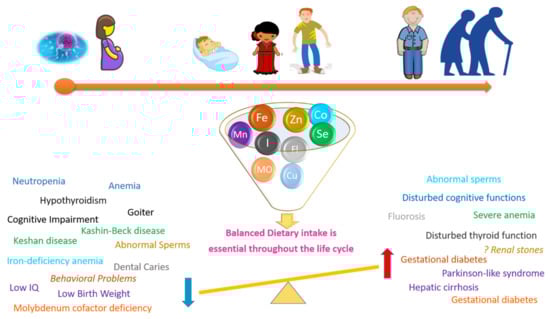 Micronutrients such as selenium, fluoride, zinc, iron, and manganese are minerals that are crucial for many body homeostatic processes supplied at low levels. The importance of these micronutrients starts early in the human life cycle and continues across its different stages. Several studies have emphasized the critical role of a well-balanced micronutrient intake. However, the majority of studies looked into or examined such issues in relation to a specific element or life stage, with the majority merely reporting the effect of either excess or deficiency. Herein, in this review, we will look in depth at the orchestration of the main element requirements across the human life cycle beginning from fertility and pregnancy, passing through infancy, childhood, adolescence, and reaching adulthood and senility, with insight on the interactions among them and underlying action mechanisms. Emphasis is given towards approaches to the role of the different minerals in the life cycle, associated symptoms for under- or overdoses, and typical management for each element, with future perspectives. The effect of sex is also discussed for each micronutrient for each life stage as literature suffice to highlight the different daily requirements and or effects.