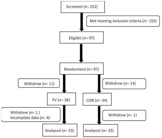 Participants in FV were instructed to increase FV intake to five servings per day, according to current guidelines for healthy eating [9]. Two group-based counseling sessions led by a nutritionist were conducted at the beginning of the 16-week intervention to support the adoption of new dietary habits. Increased FV consumption was reinforced using a behavioral support package (reading materials on guidelines, recipes, cooking tips on healthy food choices) provided through a digital platform. After two and 10 weeks during the intervention period, increased FV intake was monitored to further reinforce compliance. Participants in CON were instructed to maintain their habitual dietary intake. Importantly, both groups were instructed to maintain their habitual physical activity level.