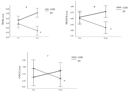 Effect of intervention on TRAIL (a), TRANCE (b), and CX3CL1 (Fractalkine) (c). FV; fruit and vegetable group, CON; control group. a.u; arbitrary units. * significant difference in FV (p < 0.05).