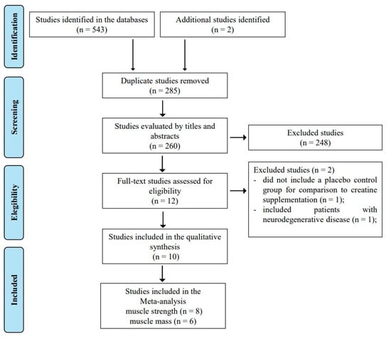 This review was conducted based on the Cochrane Manual for systematic reviews of interventions [22], and reported according to the Preferred Reporting Items for Systematic Reviews and Meta-Analyze (PRISMA-P) [23]. It was registered in the International prospective register of systematic reviews (PROSPERO), with registration number CRD42020221648. A systematic literature search was performed in Pubmed, EMBASE, Cochrane, Scopus, SportDiscus, CINAHL, Lilacs, Scielo, and Web of Science throughout May 2021. The searches included combinations of the following MESH terms: “Aged”, “Resistance training”, and “Creatine” and “Muscle strength”. No filters were applied, and we did not restrict the search by language or date of publication. Gray literature was also consulted. This step was carried out by E.S. and J.G. independently; when there were disagreements, J.B. was consulted for consensus. Figure 1 shows the flowchart of the study selection process. Studies that met the eligibility criteria were included. In addition to author and year of publication, the following characteristics of the study were extracted: details about the randomization process; blinding and allocation; sample size; ages; sex; inclusion and exclusion criteria; dose, frequency, duration of Cr and placebo (Pl) supplementation; and frequency and duration of the RT protocol. Whenever possible, we also collected compliance/adherence data relevant to the training and the supplementation protocol, as well as any adverse events that were reported. The primary outcome of this review was muscle strength, and we include muscle mass data when available. For each group and for each outcome, at both the pre- and post-intervention time points, sample sizes were included in the analyses, of which means and standard deviations were recorded. For those studies that did not report the necessary data for the analysis, the authors were contacted via e-mail.