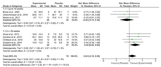 Figure 2 shows the comparison of lower-body strength between groups that supplemented with Cr or Pl. Overall, there was no significant effect from Cr on measures of lower-body strength (p = 0.18; I2 = 0%; SMD = 0.22 [95% CI −0.10–0.55]). Sub-analysis performed on study duration showed no effect from Cr if the study lasted ≤ 14 weeks (p = 0.49; I2 = 0%; SMD = −0.20 [95% CI −0.75–0.36]). However, Cr significantly increased lower-body strength compared to Pl if the study lasted ≥ 24 weeks (p = 0.03; I2 = 0%; SMD = 0.44 [95% CI 0.04–0.84]). Collectively, the quality of evidence according to GRADE was rated as low (Table 3).