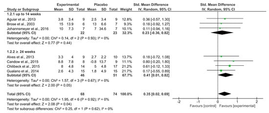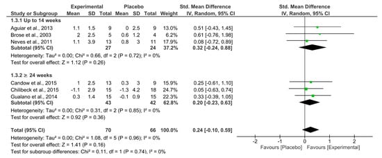 To investigate the influence of intervention time, the studies were divided into subgroups of up to 14 weeks and ≥24 weeks of duration.