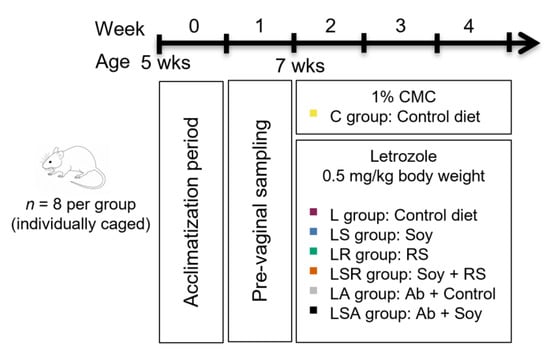 Schematic diagram of the animal experiment. Five-week-old female Sprague Dawley (SD) rats were used for the experiment. After acclimatization and the prevaginal sampling period, rats were divided into seven groups (n = 8, 7 weeks old). All animals were housed in individual cages. PCOS symptoms were induced using oral gavage of 0.5 mg/kg letrozole for 21 days simultaneously with the diet treatments. The control group was treated with 1% CMC. Control and L groups were given the control diet. The LS group was given a 0.05% soy isoflavone-based diet. The LR group was given an 11% resistant starch (RS)-based diet. The LSR group was given a mixture of both. The PA group was given the control diet along with an antibiotic cocktail (Ab). The PSA group was given the antibiotic cocktail with the control diet. CMC = carboxymethyl cellulose.