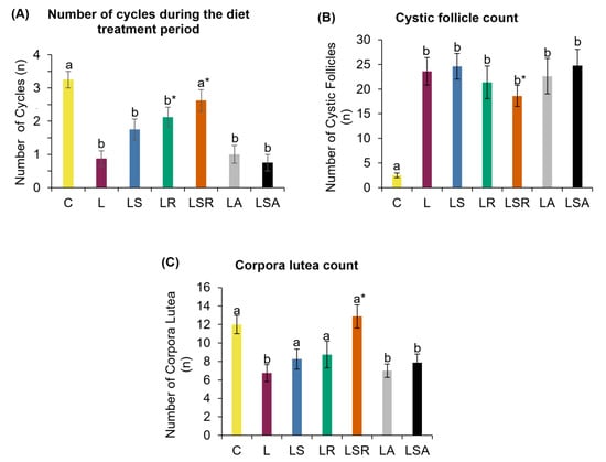 Analyses of menstrual irregularity and polycystic ovaries. (A) Number of cycles present during the diet treatment period. This analysis was performed to measure menstrual irregularity. Vaginal cell suspensions were collected daily and stained using Modified Wright–Giemsa stain to identify the cycle stage on each day. The number of cycles was counted during the 21-day diet treatment period. (B) Cystic follicle count and (C) corpora lutea count were measured using ovarian histological analysis. Excised ovaries were embedded in paraffin blocks, and the sections were stained using hematoxylin–eosin stain. All the values are expressed as the mean ± S.E. Statistical analysis was conducted by one-way ANOVA followed by Dunnett’s test for multiple comparison analysis. a, b represent p < 0.05 compared to the C group, * represents p < 0.05 compared to the L group.