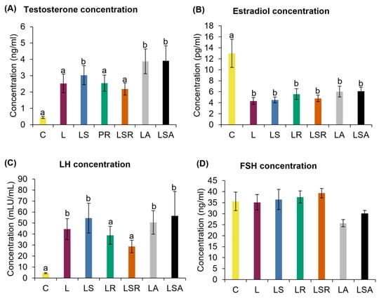 Analyses of reproductive hormones. Biochemical analyses of reproductive hormones; (A) testosterone, (B) estradiol and pituitary hormones; (C) LH and (D) FSH. These hormones were measured in the serum samples of the rats using the respective ELISA kits. All the values are expressed as the mean ± S.E. Statistical analysis was conducted by one-way ANOVA followed by Dunnett’s test for multiple comparison analysis. a, b represent p < 0.05 compared to the C group.