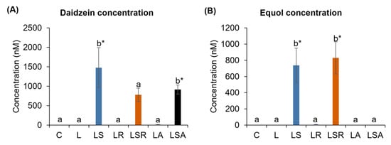 Daidzein and equol concentration analyses. Soy isoflavone metabolite concentrations in plasma were analyzed via HPLC. (A,B) show daidzein and equol concentrations, respectively. All the values are expressed as the mean ± S.E. Statistical analysis was conducted by one-way ANOVA followed by Dunnett’s test for multiple comparison analysis. a, b represent p < 0.05 compared to the C group, * represent p < 0.05 compared to the L group.