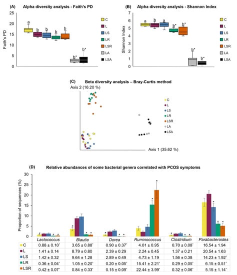 Our second hypothesis was that bacterial invasion into gut mucous caused by increased gut permeability or leaky gut is an important effector of PCOS pathogenesis. The NGS results revealed that there is a broad view of the association between PCOS and gut microbiota in PCOS rats. We noted a significant reduction in alpha diversity and a distinctive difference of beta diversity in our letrozole-treated PCOS group (L). In accordance with our results, Kelley et al. (2016) [3] suggested that due to the effect of letrozole, Faith’s phylogenetic diversity was reduced in PCOS mice. Additionally, some other human studies showed that the species and phylogenetic diversity decreased in PCOS patients compared to that in healthy patients [4,39]. While a significant reduction in the alpha diversity of antibiotic-treated groups (LA and LSA) was clear, a reduced alpha diversity in the groups treated with the soy isoflavone and resistant starch mix (LR = significant reduction and LSR) was also observed. They also showed distinctive clustering in β-diversity analysis. Hu et al. (2016) [74] reported that when resistant starch was fed to rats with colitis-associated colorectal cancer, the bacterial diversity was reduced at the phylum and species levels (measured through the Shannon index).