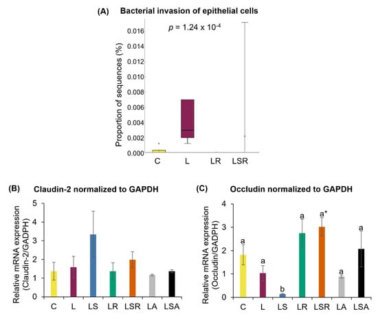 Relative abundances of microbial functional pathways were analyzed to determine the effects of gut microbiota on various mechanisms. This was performed by evaluating the differences in the function of the microbial communities ascertained from 16S rRNA sequencing using PICRUSt software. There were significant differences between the microbial functional pathways of the C and L groups. The proportion of genes responsible for bacterial invasion into intestinal epithelial cells was significantly increased in the L group, suggesting leaky gut status. The proportions of genes responsible for bacterial invasion into intestinal epithelial cells in the LR and LSR groups were significantly reduced compared to those in the L group (Figure 7A and Supplementary Figure S4). Levels of claudin-2 and occludin did not change significantly between the C and L groups. However, interestingly, the relative mRNA expression level of occludin in the LSR group was significantly higher than that in both the C and L groups (Figure 7B,C).