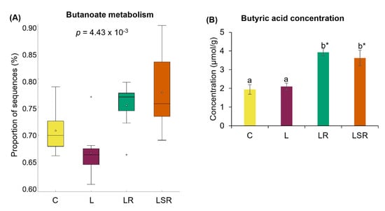 In comparison to the L group, the proportion of microbial genes responsible for butanoate metabolism was significantly high in both the resistant starch-treated LR and LSR groups (Figure 8A). To further examine the effects of SCFAs, we measured the concentrations of acetic acid, propionic acid and butyric acid using HPLC. We found that butyric acid concentrations in the LR and LSR groups were significantly higher than those in the C and L groups (Figure 8B). However, acetic and propionic acid concentrations did not show any notable changes among the groups (Supplementary Figure S5).