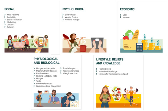 Many factors are known to influence food choices, including personal taste, affordability, cost, sustainability, culture, family, and religious beliefs (Figure 1) [19,20,21]. In addition to these factors, individual knowledge of food and nutritional science also influences choices [22].
