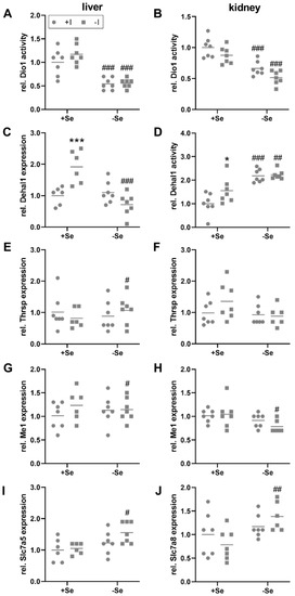 Renal Dio1 activity was also moderately affected by iodine status, which was independent of the selenium supply (Figure 3B). Iodine deficiency led to a mild decrease in activity, which is consistent with data from hypothyroid animals [57]. Again, Dehal1 activity was counter-regulated (increased by iodine), but only in +Se/−I-supplied animals (Figure 3D). Comparable counter-regulation of Dio1 and Dehal1 has been reported from hyperthyroid animals [34]. In liver, Dehal1 activity was below the detection limit, but mRNA expression was also increased in +Se/−I-supplied mice (Figure 3C). This pattern is in line with the increased circulating tT3 concentrations in animals of the +Se/−I-supplied group (Figure 1G). Others have described a decrease of hepatic Dehal1 transcripts in situations of chronic iodine deficiency in rats [48]. While the selenium status of these animals was not reported, this discrepancy also demonstrates that there is a need for further studies to understand physiological Dehal1 regulation under different conditions. Thus, although Dehal1 is not a selenoprotein, its expression and activity is modulated by the selenium and iodine status.
