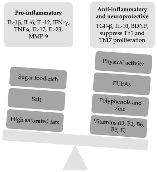 Multiple sclerosis (MS) is a chronic, neuroinflammatory disease of the central nervous system (CNS) characterized by immune-mediated damage to oligodendrocytes with myelin and axonal damage [1]. A multigenic predisposing background interacts with environmental factors (i.e., microorganisms, passive smoking, toxic, ultraviolet radiation exposure), habits (active smoking), or individual phenotype characteristics (adolescent obesity), creating a dysregulation of the immune response with a higher pro-inflammatory response [2].