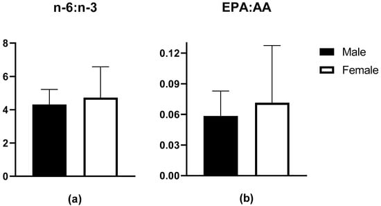 Erythrocyte fatty acid data for (a) n-6:n-3 ratio in males (n = 19, 4.31 ± 0.91) and females (n = 15, 4.73 ± 1.86); (b) EPA:AA ratio in males (0.06 ± 0.02) and females (0.07 ± 0.06).
