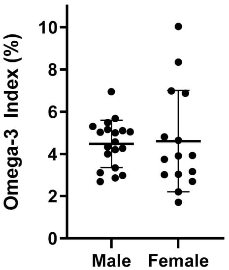 The average O3I for all athletes was 4.54% ± 1.77 and ranged between 1.71 and 10.03%. Figure 2 details the individual O3I between male and female athletes. Male and female rugby players exhibited similar O3I values (p = 0.471), 4.48% and 4.61%, respectively. Athletes who reported taking an n-3 FA supplement had a higher O3I compared to those not taking a supplement (4.82% vs. 3.94%, p = 0.183). While the difference failed to reach statistical significance, those not taking a supplement were in the high-risk category (<4%) and those taking a supplement were in the intermediate-risk category (4–8%). When distributed by O3I category, there were a greater proportion of male and female rugby players in the high-risk category for those not taking a supplement (45.5% vs. 39.1%) (Table 3). However, 61% of rugby players taking a supplement were in the low- to intermediate-risk categories compared to 54.5% in those not supplementing.