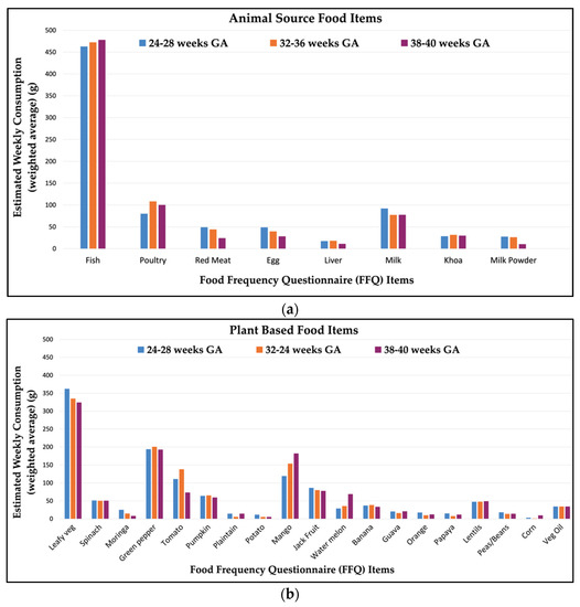 Estimated average weekly consumption (grams) of food items through the course of gestation among (n = 251) pregnant women in Sylhet, Bangladesh: (a) animal source and (b) plant-based food items.
