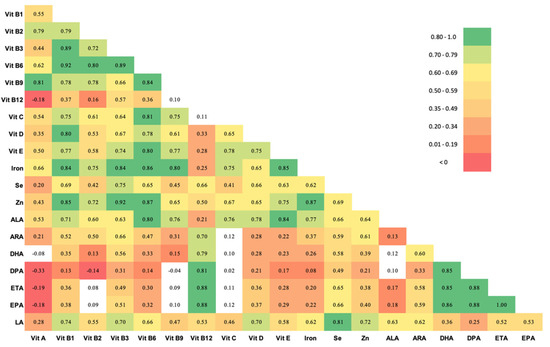 Spearman correlations between 20 nutrients in pregnant women in the Projahnmo cohort, Sylhet, Bangladesh. Unshaded cells did not meet statistical significance. Abbreviations: Vit = Vitamin, Se, selenium; Zn, Zinc; ALA, Alpha Linolenic acid; ARA, arachidonic acid; DHA, docosahexaenoic acid; DPA, docosapentaenoic acid; ETA, eicosatrienoic acid; EPA, eicosapentaenoic acid; LA, linoleic acid.