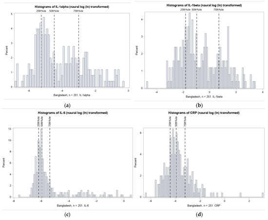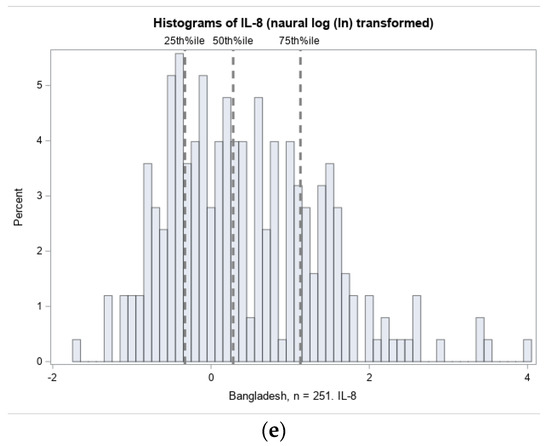 Distribution of inflammation biomarkers (natural log transformed) in Projahnmo cohort. The 75% thresholds for each cytokine are: (a) IL-1α: 0.05 pg/mg total protein; (b) IL-1β: 2.01 pg/mg total protein; (c) IL-6: 0.0046 pg/mg total protein; (d) IL-8: 3.09 pg/mg total protein; and (e) CRP: 0.04 ng/mg total protein.