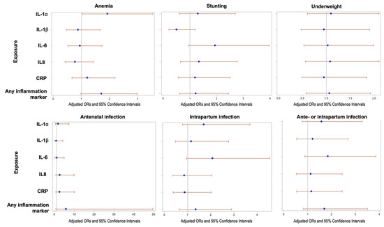 The odds ratios (ORs) and 95% confidence intervals for elevation (top quartile) of IL-1α, IL-1β, IL-6, IL-8, and CRP in umbilical cord blood are shown for maternal nutrition (anthropometrics and anemia) and infections in pregnancy (Figure 4). Maternal anemia (enrollment Hb level < 11 g/dL) was significantly associated with greater odds of elevated IL-1α (aOR = 1.92, 95% CI: 1.04, 3.54). No other statistically significant results (p < 0.05) were observed among these exposures, though ORs tended to be greater than one. Greater odds of elevated IL-6 had a borderline significant association with stunting (maternal height < 145 cm; aOR = 1.97, 95% CI: 0.97, 4.02) and intrapartum infections (aOR = 2.07, 95% CI: 0.95, 4.54). aORs for antenatal infection and for any antenatal or intrapartum infection, as well as for overweight BMI status (data not shown), were greater than one across all inflammatory markers, though none met statistical significance.