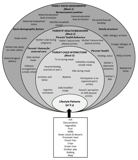 The different contextual factors candidates for their possible association with lifestyle patterns were structured from the most distal to the most proximal within a three-nested-block framework (Figure 1), derived from both socio-ecological [15,21] and hierarchical [22] approaches, and were organized as follows: family socio-demography, parents health/behaviors, and parent-child interactions. These variables were selected on the basis of both the associations highlighted in the literature between contextual factors and each of the EBRBs under study [23], and their availability in the EDEN study. Given the cross-sectional approach, when available, we prioritized contextual factors collected at year 5. Otherwise, a few variables still thought valuable to consider before year 5 were selected because they are known to be relatively stable across early childhood. More details on the data used are provided in Additional Text S1 (“Family socio-ecological factors definition”).