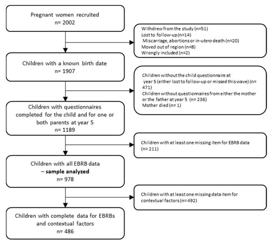 Of the 2002 recruited mothers, 95 (4.7%) withdrew from the study during pregnancy, mainly for reasons of convenience, leaving 1907 children with a known birth date (Figure 2). Children were included in our analysis if their parents had completed the child questionnaire, as well as either the mother or the father self-reported questionnaire at year 5 (n = 1190). Complete data for all EBRBs was an additional criterion, which led to a study sample of 978.