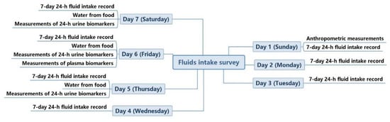 - Zhang, N.; Du, S.; Tang, Z.; Zheng, M.; Yan, R.; Zhu, Y.; Ma, G. Hydration, Fluid Intake, and Related Urine Biomarkers among Male College Students in Cangzhou, China: A Cross-Sectional Study—Applications for Assessing Fluid Intake and Adequate Water Intake. Int. J. Environ. Res. Public Health 2017, 14, 513. [Google Scholar] [CrossRef] [Green Version]