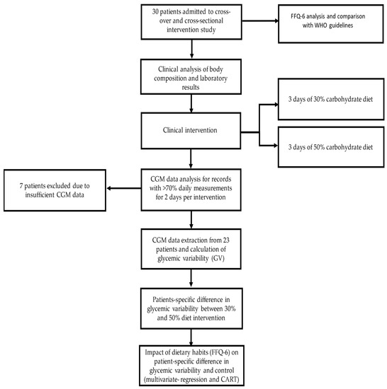 Patients were carefully monitored during the dietary interventions by a dietitian, diabetologist, nurse, and the principal investigator. Subjects were required to strictly follow the nutrition plan and avoid any additional food consumption. During the experiment, their blood glucose was measured using the continuous glucose monitoring (CGM) system and the self-monitoring of blood glucose (SMBG). The CGM measured real-time interstitial glucose concentration and was not blinded, so the diabetologist and the patients had continuous access to glucose concentrations. The diabetologist and dietician calculated the daily insulin intake (insulin base and boluses) for each patient to provide optimal glycaemic control. Adverse events, defined as severe hypoglycaemia, diabetic ketoacidosis, or allergic reactions, were registered for all patients during and 48 h before and after the dietary intervention. Detailed scheme of the study is presented in Figure 1.