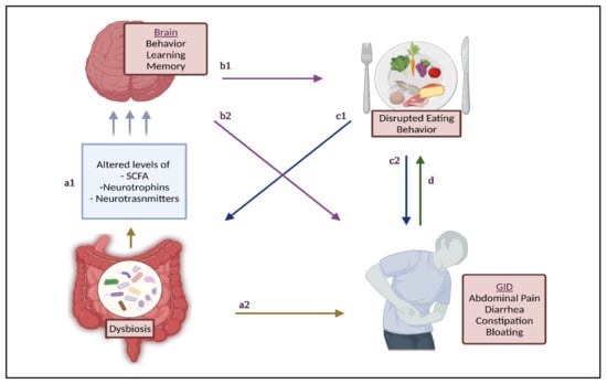 Behavioral changes can also impact eating behaviors, which in turn contribute to GID, dysbiosis, and dysbiosis-related GID. Wallisch et al. found that children with ASD who were picky eaters were significantly more likely to have behavioral differences compared to non-picky eaters [64]. Further-more, picky eating was also significantly associated with increased odds of GI symptoms and sleep disturbances in children with ASD [12]. Sleep disturbances in turn increase the risk of lower scores in social cognition and communication, intellectual development, and the performance of daily living skills [12]. Eating behaviors can also impact GM due to the compromised diet quality. For example, it has been reported that children with ASD have a significantly lower fiber intake compared to TD children [65,66], and have a high preference towards sweet snacks and soft drinks [67,68,69]. Picky eating also affects GID risk. For example, higher food fussiness has been found to increase the risk of functional constipation, and functional constipation occurrence predicted a greater risk of picky eating in children, indicating the presence of a bi-directional relationship between food intake and GID, leading to the developing of a vicious cycle between these two factors [70]. Addressing these complications can prove to be more challenging in ASD, as the child’s food preferences, lack of acceptance of new foods, and lack of parental knowledge may pose limitations in adhering to nutritional advice [71].