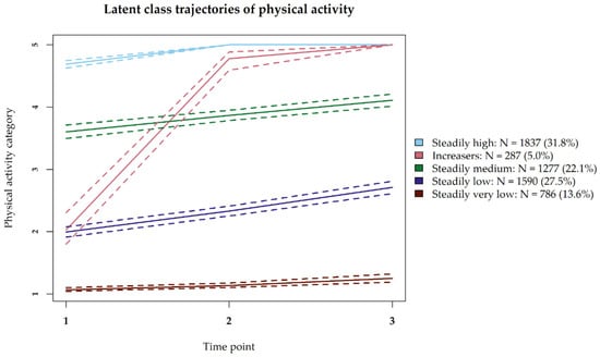 Five distinct trajectories were defined (Figure 1, Supplementary Table S2). Four trajectories were steady over time, although a slight increase was shown in each group. A total of 1837 (32%) participants belonged to the trajectory that reported ‘steadily high’ physical activity. Another 1277 (22%) participants reported ‘steadily medium’ levels, and 1590 (28%) participants reported ‘steadily low’ levels. A total of 786 (14%) participants reported ‘steadily very low’ levels of physical activity. Finally, 287 (5%) participants increased their physical activity during the pandemic from the level of the ‘steadily low’ to the ‘steadily high’ group, referred to as ‘increasers.