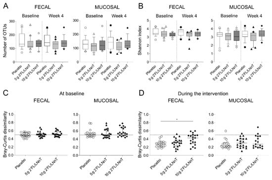 Microbiota diversity measures from fecal and mucosal samples throughout the intervention with 2′FL/LNnT or placebo in patients with irritable bowel syndrome (IBS). α-diversity, (A) Number of OTUs (operational taxonomical units) and (B) Shannon index at baseline and after 4-week intervention in placebo, 5 g 2′FL/LNnT and 10 g 2′FL/LNnT groups. β-diversity, (C) Between-patient microbiota dissimilarity at baseline and (D) within-patient microbiota dissimilarity in fecal samples and mucosal biopsies during intervention period in placebo, 5 g 2′FL/LNnT and 10 g 2′FL/LNnT group. 2′FL/LNnT, 4:1 mix of 2′-O-fucosyllactose and lacto-N-neotetraose. (A,B) Data are shown as median (10–90th percentile). (C,D) Dissimilarities were analyzed by Bray-Curtis dissimilarity index. Dashed line at y = 0.5 indicates intermediate dissimilarity. Data are shown as median (interquartile range). (A–D) Between-group comparisons calculated by Kruskal–Wallis test followed by Dunn’s correction for multiple comparisons. * p < 0.05.