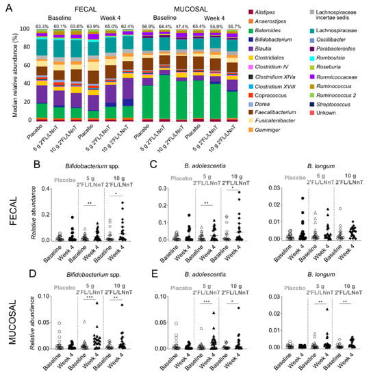 Microbiota profile and Bifidobacterium spp. throughout the intervention period with 2′FL/LNnT or placebo. (A) Relative abundance of the 23 most abundant OTUs detected in fecal and mucosal samples from placebo and 5 g 2′FL/LNnT and 10 g 2′FL/LNnT groups at baseline and week 4. Relative abundance of (B) fecal and (D) mucosal bifidobacteria at baseline and week 4 in placebo, 5 g 2′FL/LNnT and 10 g 2′FL/LNnT groups. (C) Relative abundance of fecal B. adolescentis and B. longum at baseline and week 4. (E) Relative abundance of mucosal B. adolescentis and B. longum at baseline and week 4. B., Bifidobacterium. (A) The median relative abundance is presented as percentage (%). OTUs are identified at genus level in italics, except the order Clostridiales, and the families Lachnospiraceae and Rumnicoccaceae. Percentages on top of each column indicate the proportion that these OTUs occupy in the whole microbiota composition detected. (B–E) Data shown as median (interquartile range), where each dot represents the relative abundance of each patient. Baseline (empty symbol) and week 4 (filled symbol) in placebo (circle), 5 g 2′FL/LNnT (triangle) and 10 g 2′FL/LNnT (diamond) group. Between-group comparisons calculated by the Kruskal–Wallis test followed by Dunn’s correction for multiple comparisons. * p < 0.05, ** p < 0.01, *** p < 0.001.