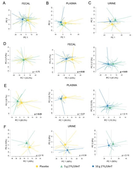 Metabolite profiles during the intervention period with 2′FL/LNnT or placebo. Principal component analysis (PCA) plots based on the fold-change (week 4/baseline) of (A) 384 fecal metabolites, (B) 217 plasma metabolites and (C) 528 urine metabolites in placebo (yellow circle), 5 g 2′FL/LNnT (teal triangle) and 10 g 2′FL/LNnT (blue diamond). Separate PCA plots presenting the profile fold-change of (D) fecal metabolites, (E) plasma metabolites, and (F) urine metabolites of the intervention groups in pairs: placebo and 5 g 2′FL/LNnT, placebo and 10 g 2′FL/LNnT and, 5 g and 10 g 2′FL/LNnT. The p values in (D–F) indicate statistical significance between the score group means (centroids).