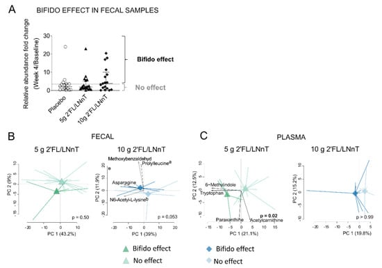 The metabolite profile modulation in relation to the effect of the 2′FL/LNnT on bifidobacteria (bifido effect). (A) Bifido effect based on the relative abundance fold change (week 4/baseline) of Bifidobacterium spp. in fecal samples. The bifido effect was defined as a fold change of bifidobacteria relative abundance during the intervention (week 4/baseline) greater than the upper quartile of the relative abundance fold change in the placebo group (week 4/baseline > 3.70). The lack of increase in bifido below the threshold was considered as “no effect”. (B) Principal component analysis (PCA) based on the fecal metabolite fold change in patients who presented a bifido effect (dark color) and no effect (light color) in the 5 g 2′FL/LNnT (left, teal triangles) and 10 g 2′FL/LNnT (right, blue diamonds). 5 g 2′FL/LNnT group: n = 5 bifido effect and n = 15 no effect; 10 g 2′FL/LNnT: n = 10 bifido effect; n = 8 no effect. a prolylleucine (compound nr 0163), b N6-Acetyl-L-lysine (compound nr 1733). (C) PCA based on the plasma metabolite fold change in patients who presented a bifido effect and with no effect in the 5 g 2′FL/LNnT and 10 g 2′FL/LNnT. 5 g 2′FL/LNnT group: n = 5 bifido effect and n = 15 no effect; 10 g 2′FL/LNnT: n = 10 bifido effect; n = 8 no effect. PCA plots with a clear separation between centroids show the loading of the most relevant metabolites involved in the observed pattern. The p values in (B,C) indicate statistical significance between the score group means (centroids).