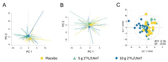 Antibacterial response gene expression profile during the intervention period with 2′FL/LNnT or placebo. Biopsies obtained from IBS patients before and after 4-week intervention were analyzed by polymerase chain reaction (PCR) array for 84 genes related to antibacterial response. (A) A principal component analysis (PCA) based on 80 unique genes (4 genes excluded due to expression below detection limit) at baseline in placebo (n = 19, yellow circle), 5 g 2′FL/LNnT (n = 20, teal triangle) and 10 g 2′FL/LNnT (n = 19, blue diamond) groups. (B) PCA and (C) orthogonal partial least squares-discriminant analysis (OPLS-DA) scatter plot of the antibacterial response gene expression profile log2 fold change (week 4/baseline) during the intervention between placebo, 5 g 2′FL/LNnT and 10 g 2′FL/LNnT groups. The R2 value determines goodness of the fit and the Q2 value represents the predictive ability of the model. In biological models, R2Y ≥ 0.5 and Q2 ≥ 0.4 are considered satisfactory.