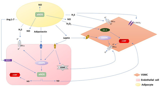Adiponectin is profusely produced and released by PVAT under physiological conditions [37]. It is secreted in different polymeric forms, which differ from each other by molecular weight: multimeric, hexameric, trimeric, and globular [38]. Adiponectin is known as a vasodilator, which acts through different mechanisms affecting endothelial cells and VSMCs directly. First of all, adiponectin activates in both mentioned locations 5′ adenosine monophosphate-activated protein kinase (AMPK), which is responsible for phosphorylation of endothelial nitric oxide synthase (eNOS) [39,40]. Moreover, adiponectin increases the production of 3,4-tetrahydrobiopterin (BH4), which is an important cofactor of eNOS [41]. As a consequence, the synthesis of the well-known vasodilator nitric oxide (NO) is increased. In addition, AMPK induces the opening of large-conductance calcium-activated potassium channels (BK channels) in VSMCs, which also contributes to vasodilation [42]. AMPK is activated mainly by globular and trimeric forms of adiponectin. Additional effects of multimeric adiponectin are the downregulation of glucose blood levels by the stimulation of glucose uptake by muscles, the improvement of insulin sensitivity, or a reduction in hepatic glucose production [43]. Moreover, it also regulates fatty acid metabolism by increasing the high-density lipoprotein (HDL) concentration and decreasing the triglycerides [44].