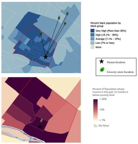 Figure 1 provides a visual geographic representation of two participants’ shopping patterns in relation to their home location and either neighborhood racial distribution or poverty level. The participants frequently traveled outside of the city to go food shopping. Only two participants, those who reported primarily walking to food stores, exclusively shopped within the boundaries of the city.