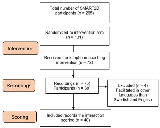 We used a longitudinal design in which intervention sessions were recorded and scored using a tool developed by the SMART2D consortium for this purpose. A total of 75 telephone-facilitated coaching calls from 39 individuals were recorded. After excluding four recordings in languages other than Swedish or English, a similar number of recordings for each of the nine sessions and from each of the facilitators were selected. A total of 40 sessions (three to six recordings from each of the nine sessions) were included in the interaction scoring and analysis (Figure 2).