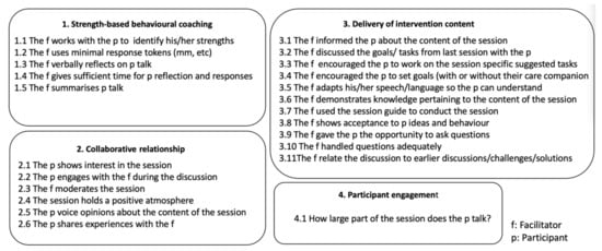 To evaluate the intervention fidelity, 40 selected recordings were scored using an interaction scoring tool consisting of 23 statements that assessed the interaction between the participant and facilitator based on four constructs: (1) Strength-based behavioral coaching techniques with focus on participants self-determination and strengths; (2) Collaborative relationship between facilitator and participant with focus on interest, atmosphere, moderation and experience; (3) Delivery of intervention content with focus on information, knowledge, goals and acceptance; (4) Participant engagement measured by the percentage of time the participant spoke in the session. The main focus was on the fidelity aspects of adherence and delivery. Figure 3 gives an overview of the statements included in the scoring tool.
