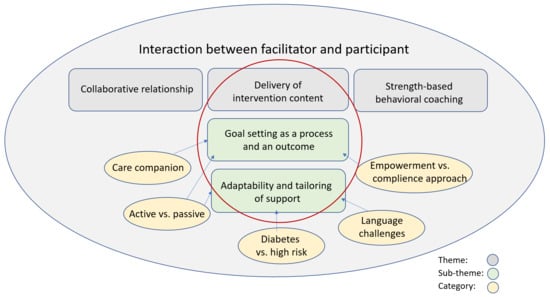 The three constructs from the quantitative results were deductively identified as themes in the qualitative data: (1) Collaborative relationship, (2) Delivery of intervention content and (3) Strength-based behavioral coaching. In addition, other themes were developed inductively. These themes were categorized as subthemes to each predefined theme. All themes are connected to aspects of interaction between the facilitator and participant (Figure 4).