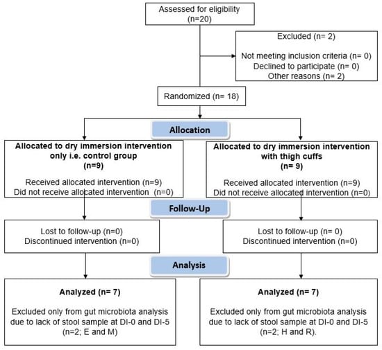 Figure 1 shows the participants’ flow. All data are presented as the mean ± SEM. The normality of each distribution and homogeneity of variance were assessed with the Kolmogorov–Smirnov and Fischer’s exact test, respectively. This clinical trial was originally designed to assess the effects of thigh cuffs on the hematological, cardiovascular and musculoskeletal system responses induced by 5 days of DI. Statistical significance was checked using a two-way ANOVA for repeated measures. As cuffs did not have any significant effects on the gut microbiota composition (Supplementary Figures S1 and S2), the Results and Discussion sections only focus on DI effects on gut microbiota. The paired t-test was used to compare directly DI-0 and DI-5. The Wilcoxon rank sum test was chosen when the normality and/or equal variance tests failed. For all statistical analyses, the significance level was set at 0.05. Data were analyzed using the statistical package GraphPad Prism version 6.02 for Windows (GraphPad Software, La Jolla, CA, USA).
