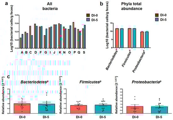 To confirm the similar quantity and quality of DNA extraction between groups, an “all bacteria” qPCR analysis was performed (Figure 2a). As expected, overall, “all bacteria” quantity was comparable among subjects at DI-0 (12.71 ± 0.26 log of bacterial cells/g feces) and DI-5 (12.69 ± 0.22 log of bacterial cells/g feces), thus confirming the robustness of the extraction method. Moreover, the qPCR analysis suggested that the abundance of the three main phyla was not changed between DI-0 and DI-5: BacteroidetesP (11.66 ± 0.10 log10 vs. 11.62 ± 0.08 log10), FirmicutesP (11.72 ± 0.10 log10 vs. 11.68 ± 0.09 log10) and ProteobacteriaP (9.62 ± 0.18 log10 vs. 9.67 ± 0.14 log10) (Figure 2b). Due to its robustness, the “all bacteria” quantification was then used as a baseline control for phylum quantification by qPCR (“housekeeping” all-bacteria). Statistical analysis of each phylum abundance relative to the “all bacteria” abundance, expressed as 2−ΔΔCt, showed no difference before (DI-0) and DI-5 (Figure 2c). This was confirmed by the metagenomic analysis that did not show any variation in the abundance of these three main phyla and of Actinobacteria (see below).