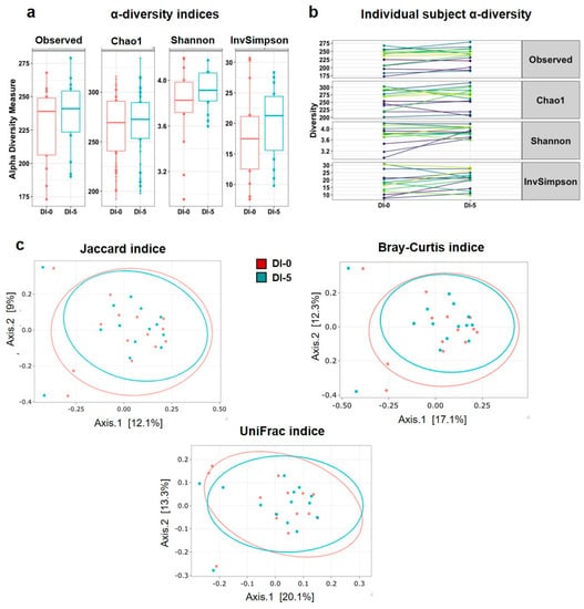 To measure the overall microbiota changes after DI, the α and β diversity of the taxonomic profiles, obtained by 16S rRNA metagenomic sequencing of stool samples (n = 14 men), were compared before (DI-0) and after DI (DI-5). This analysis showed that α diversity (Observed, Chao1, Shannon and InvSimpson indices) was not modified by DI (Figure 3a). Moreover, the individual plots showed similar changes for all α diversity indices in all participants (Figure 3b), without significant differences between DI-0 and DI-5 (Observed: p = 0.166; Chao1: p = 0.984; Shannon: p = 0.121; InvSimpson: p = 0.348). These findings indicated the absence of DI effects on gut microbiota richness and evenness. Similarly, the PCoA plots (Figure 3c) established from dissimilarity matrices to explain the β diversity using the Jaccard (p = 0.998), Bray–Curtis (p = 0.997) and UniFrac (p = 0.999) indices did not detect any difference between DI-0 and DI-5. These results revealed the absence of DI effects on OTU diversity.