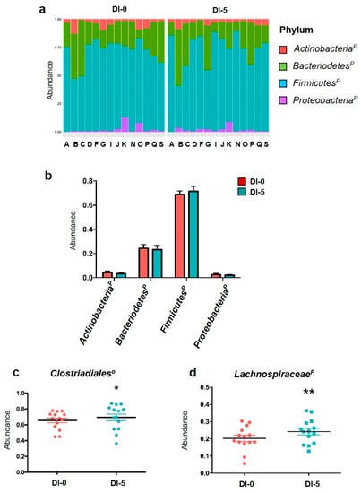 Abundance of phyla by 16S rRNA sequencing. (a) Individual abundance of the four main gut microbiota phyla in humans before (DI-0) and after 5 days of dry immersion (DI-5) in healthy men (n = 14). (b) Comparison (t-test) of the abundance of these four phyla at DI-0 and DI5 in healthy men (n = 14). (c) Clostridiales order abundance is significantly increased by DI. (d) Lachnospiraceae family abundance is increased by 5 days of dry immersion. p = Phylum; O = Order; F = Family; * p < 0.05; ** p < 0.01 (paired t-test). Data are mean ± SEM.