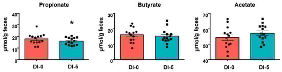 SCFAs quantification in stool samples highlighted a significant decrease of propionate concentration at DI-5 compared with DI-0 (17.8 ± 1.2 μmol/g feces at DI-0 vs. 16.0 ± 0.8 μmol/g feces at DI-5, p < 0.05) (Figure 5). DI did not have any effect on butyrate and acetate.