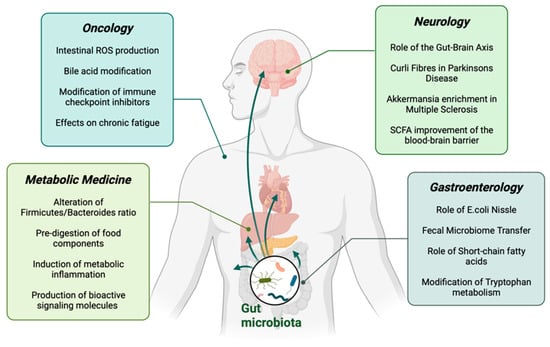 While the gastroenterological diseases reported so far share a primary chronic inflammatory pathology, microbiome-based research has also been conducted in patients with various forms of gastrointestinal (GI) cancer. Differences in the composition of the gut microbiome were found for gastric and colorectal cancer (CRC), whereby C. diff. was found to be enriched to approx. 20% in the latter [32]. Presently, it is thought that unfavourable gut microbiota may promote cancer development by multiple mechanisms, e.g., immune response changes and carcinogenic metabolite production [33].