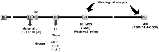 Experimental timeline of the study. Embryonic day (E). HI—hypoxia–ischemia. P, postnatal day. DTI, diffusion tensor imaging. Lf—lactoferrin. NODDI, neurite orientation dispersion and density index.