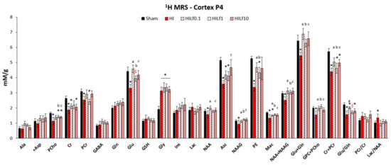 Neurochemical profiles presented as mean ± SEM. All concentrations are expressed in mM/g. Differences between groups (Sham, HI, HILf0.1, HILf1, and HILf10) 24 h post-HI (p < 0.05, * HI vs. SH, $ difference between HILf groups. a b c HILf0.1, 1 or 10 vs. HI, respectively. Differences were determined by one-way ANOVA and considered significant when p < 0.05. Asc, ascorbate; Ala, alanine; +Asp, aspartate; Cr, creatine; GABA, gamma-aminobutyric acid; Gln, glutamine; Glu, glutamate; GSH, glutathione; Gly, glycine; Ins, myo-inositol; Lac, lactate; Mac, macromolecules; NAAG, N-acetylaspartylglutamate; NAA, N-acetylaspartate; PCho, phosphocholine; PCr, phosphocreatine; PE, phosphoethanolamine.